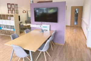 - Großzügige Besprechungsbereiche mit Präsentationsbildschirmen